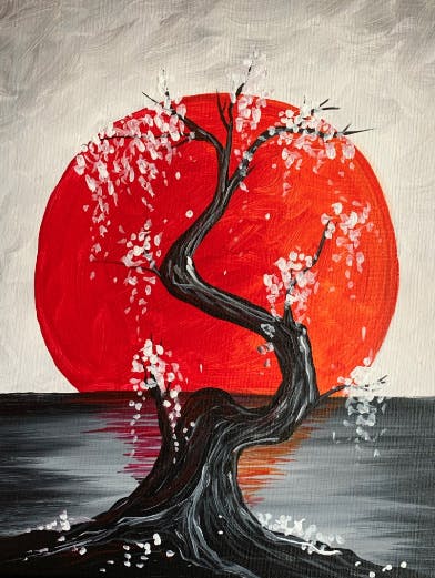 Join Kabuki Japanese Restaurant x Pinot's Palette on December 13 from 5pm-8pm to paint the Japanese Crimson Moon (seen here) while eating fresh sushi paired with top of the line sake.
